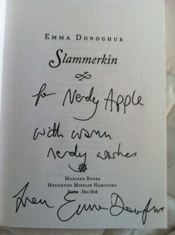 I bought one of her back catalog and am excited to dive into it. Her books are all stand alones and generally historical fiction. I had her sign the paperback of Slammerkin for me. She thought the ‘Nerdy Apple’ was fun.