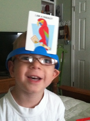 First he grabs a card, looks at it, asks what the word is, repeats it, then put it on his head band. He then asks very specific questions like “Do I have feathers?” and “Can I fly?” followed by an excited “AM I A PARROT?” as if he actually guessed it.